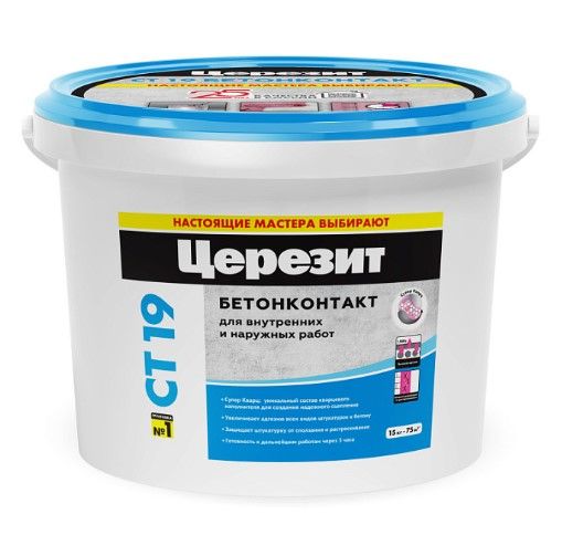 Грунтовка CT 19 Бетонконтакт предназначена для обработки гладких слабо впитывающих оснований стен из монолитного или сборного железобетона перед нанесением плиточных клеев, цементных и гипсовых штукатурок.