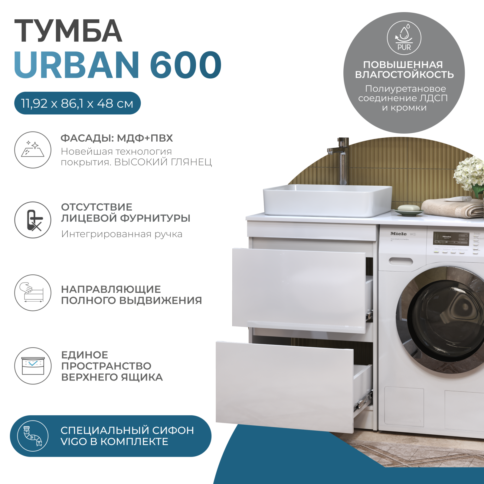 2 ящика, направляющие шариковые полного выдвижения, 1 сифон