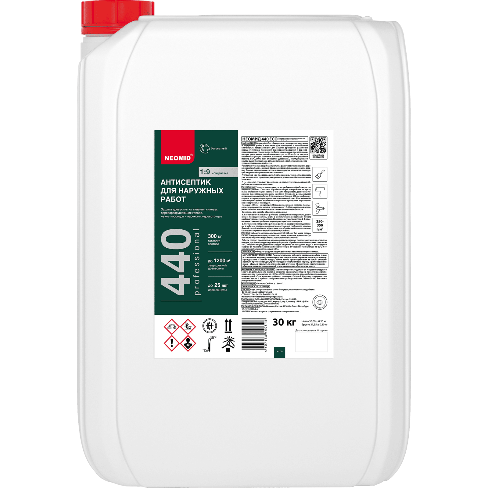 440 ECO — эффективный концентрированный антисептик для работ на улице и в зданиях, в том числе, и во влажных помещениях. Обработанная составом древесина остается защищенной от гниения и поражения грибком, плесенью, насекомыми долгое время – до 25 лет.