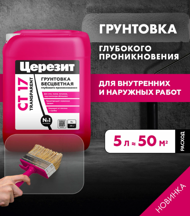 Грунтовка CT 17 предназначена для обработки поверхностей перед нанесением штукатурных и напольных смесей, плиточных клеев и т.д.