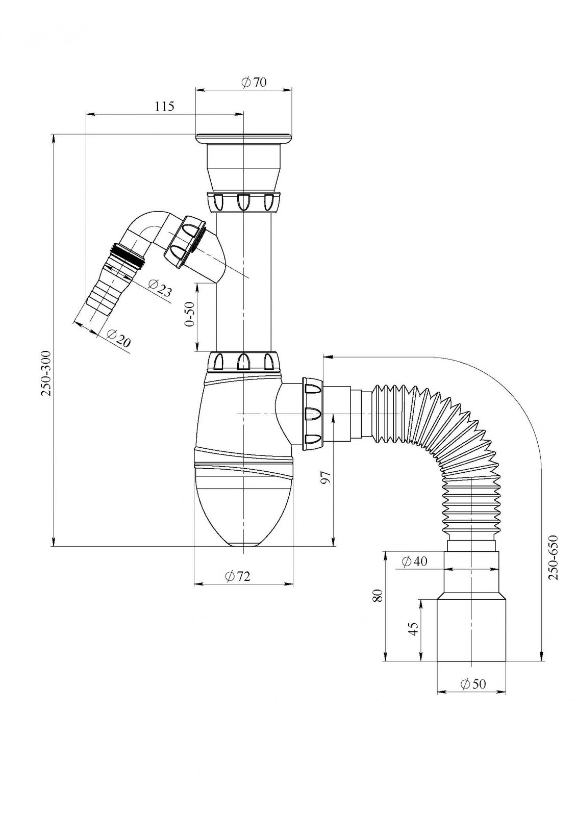 A320V CИФОН ДЛЯ ТЮЛЬПАНА, УМЫВАЛЬНИКА С ПРИКРУЧИВАЮЩИМСЯ ВЫПУСКОМ 1 1/2 С ВЫХОДОМ ПОД СТИРАЛКУ И ГИБКИМ СОЕДИНЕНИЕМ д.40х40/50